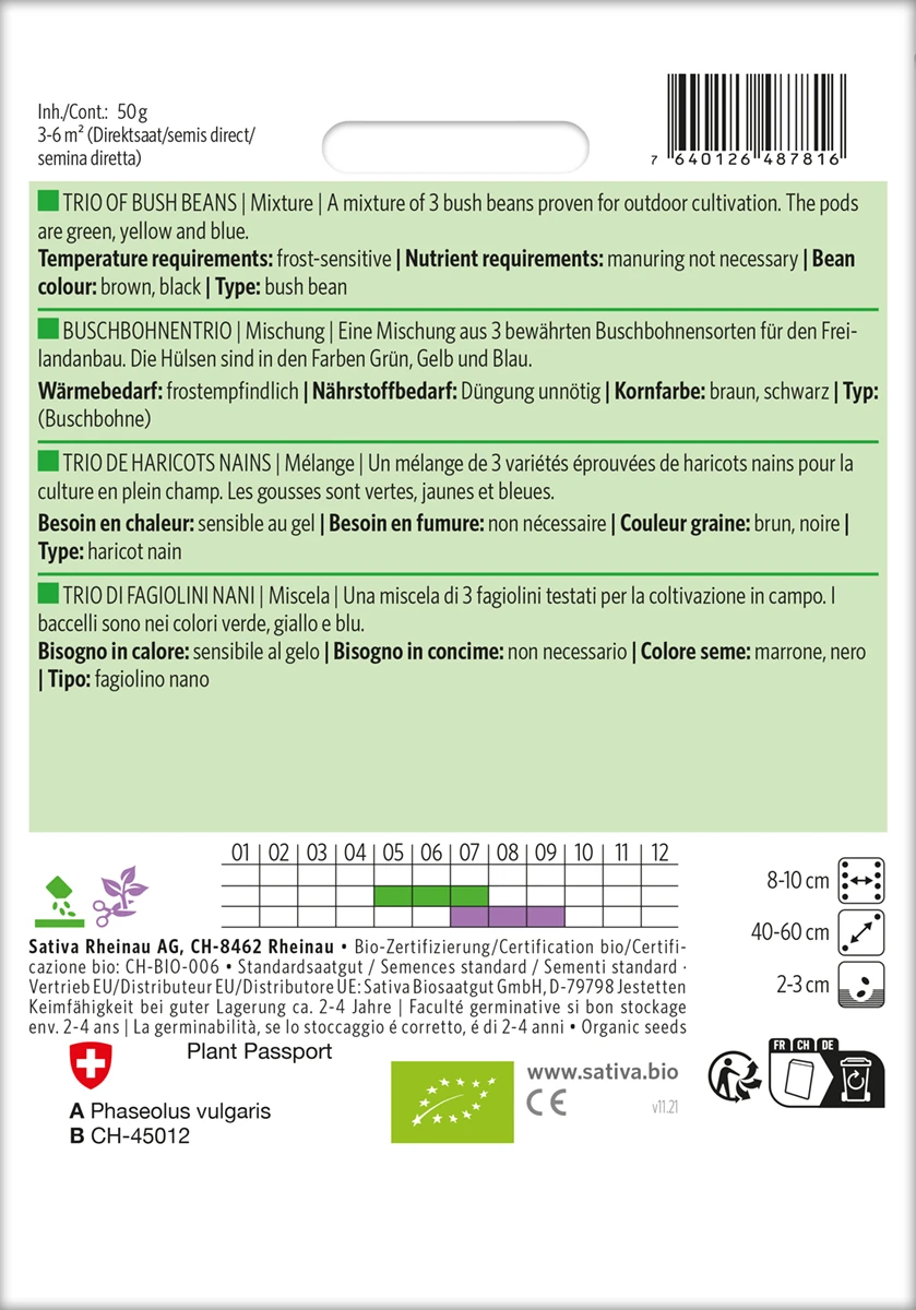 Eine Mischung aus 3 bewährten Buschbohnensorten für den Freilandanbau. Die Hülsen sind in den Farben Grün, Gelb und Blau.