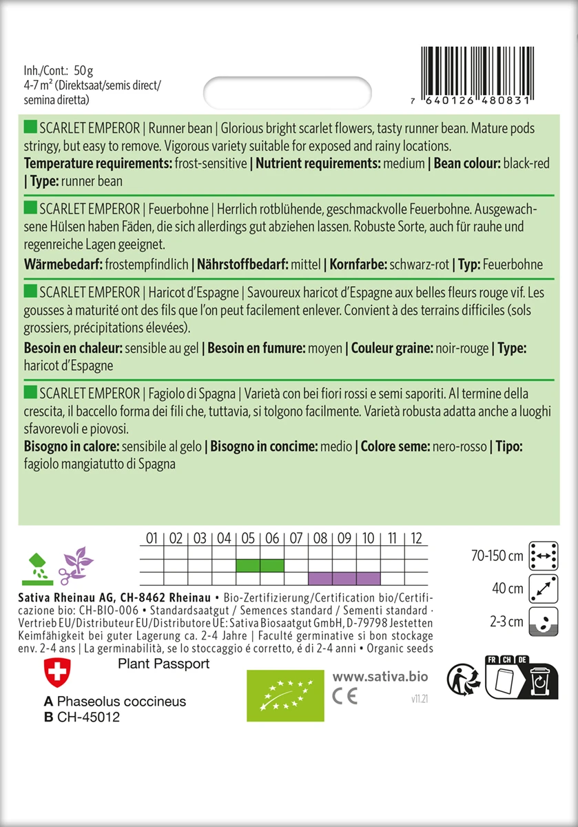 Herrlich rotblühende, geschmackvolle Feuerbohne. Ausgewachsene Hülsen haben Fäden, die sich allerdings gut abziehen lassen. Robuste Sorte, auch für raue und regenreiche Lagen geeignet.