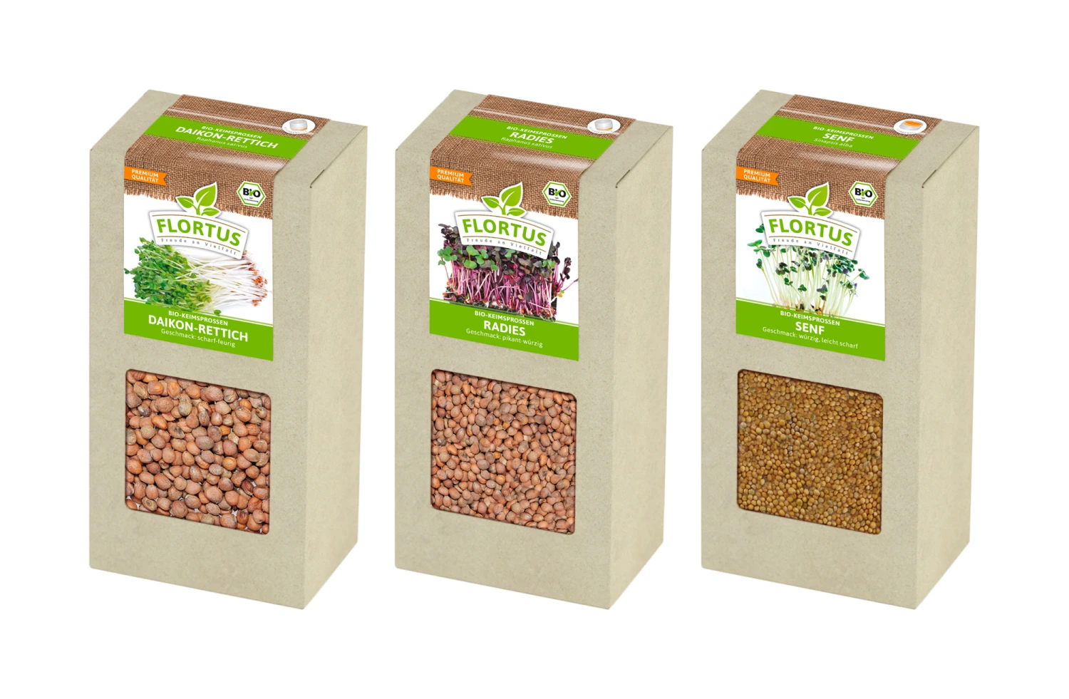Lust auf etwas Scharfes? Dann ist das 3er-Set mit scharfen Bio-Keimsprossen genau passend. Das FLORTUS Sprossen-Set ist für alle, die es lieber etwas schärfer mögen. Die knackigen Sprossen lassen sich leicht auf dem Fensterbrett ziehen und sind vor allem im Winter eine Bereicherung auf dem Speiseplan. Scharfe Sprossen schmecken lecker auf Butterbrot und in vielen Gerichten. Rettich-, Radies- und Senfsprossen haben eine angenehme leichte Schärfe. Sie enthalten viele Vitamine, Ballaststoffe und Mineralstoffe.