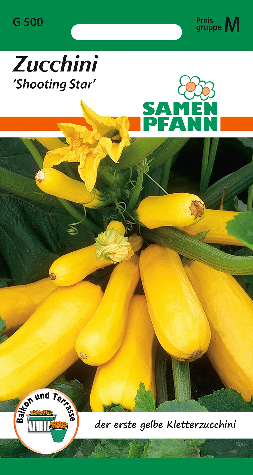 Shooting Star ist der erste gelbe Kletterzucchini, klettert an Rankhilfen bis zu 2 m hoch. Gut geeignet für kleinere Gärten und für Anbau im Kübel oder Topf. Bildet zarte, goldgelbe Früchte mit feinem Aroma.