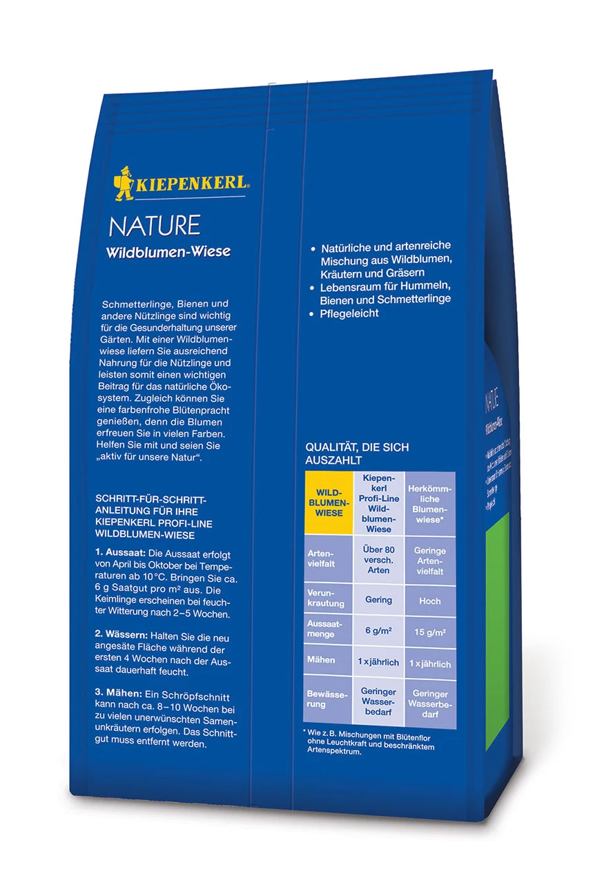 ProfiLine Nature. Natürliche und artenreiche Mischung aus Wildblumen, Kräutern und Gräsern. Lebensraum für Hummeln, Bienen und Schmetterlinge. Pflegeleicht. Geringe Aufwandsmenge : nur 6-7 g/m². Reicht für ca. 40 m².
