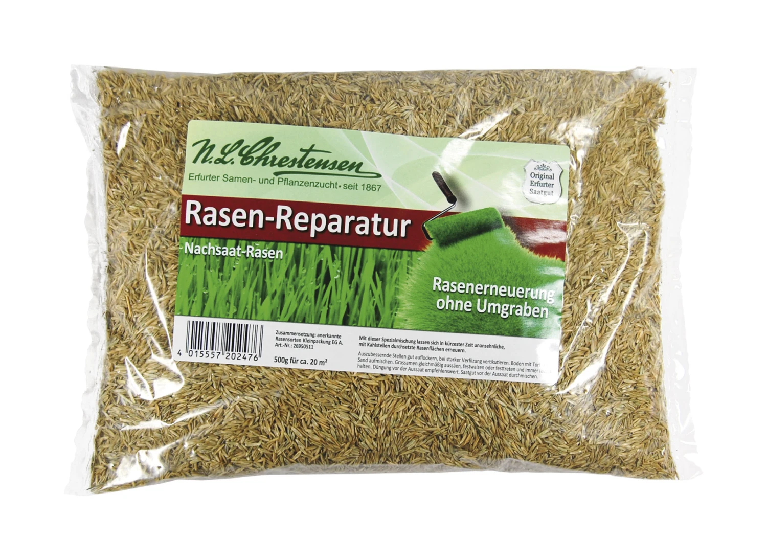 Mit dieser Spezialmischung ausgesuchter Gräser lassen sich in kürzester Zeit unansehnliche, mit Kahlstellen durchsetzte Rasenflächen erneuern. Ohne Umgraben.