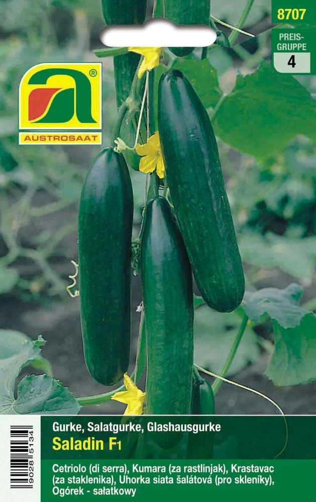 Die Austrosaat Salatgurke Saladin F1 (Cucumis sativus L.) ist eine ertragssichere Treibgurkensorte für die Aufleitung im Glashaus und bildet Früchte mit einer Länge von 32 bis 38 cm aus.