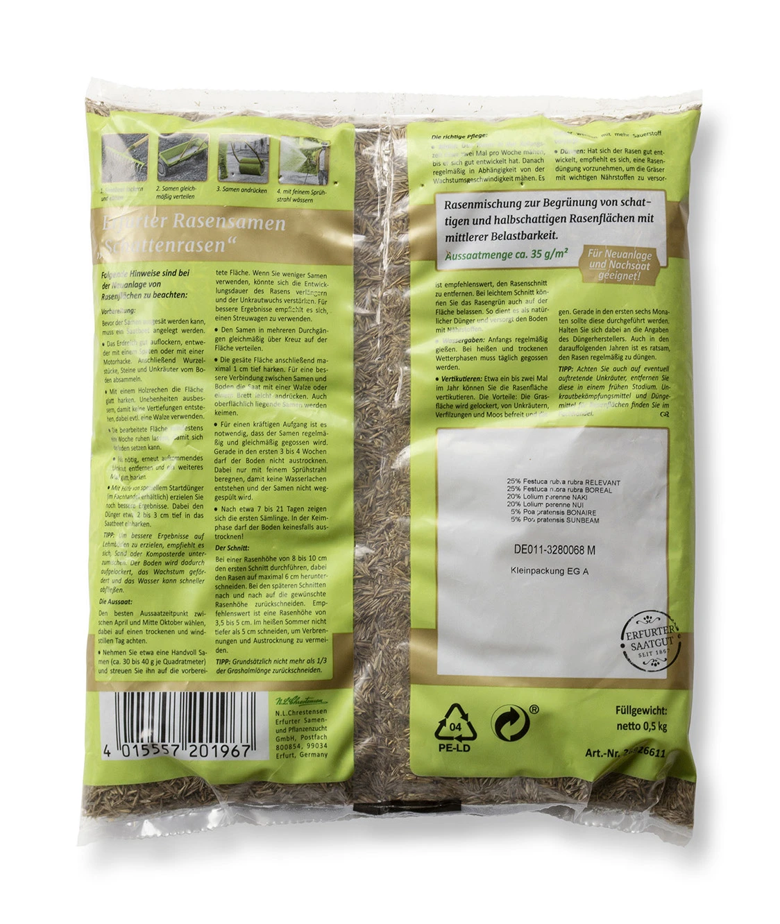 Besondere Rasenmischung zur Begrünung von schattigen und halbschattigen Rasenflächen. Eine Mischung, die durch ihre spezielle Zusammensetzung optimal auf die schwierigen Verhältnisse in Schatten- und Halbschattenbereiche abgestimmt ist. Durch komplexe Auswahl verschiedener Komponenten erreicht der Rasen eine mittlere bis hohe Belastbarkeit. Aussaatmenge 30 g / m².
