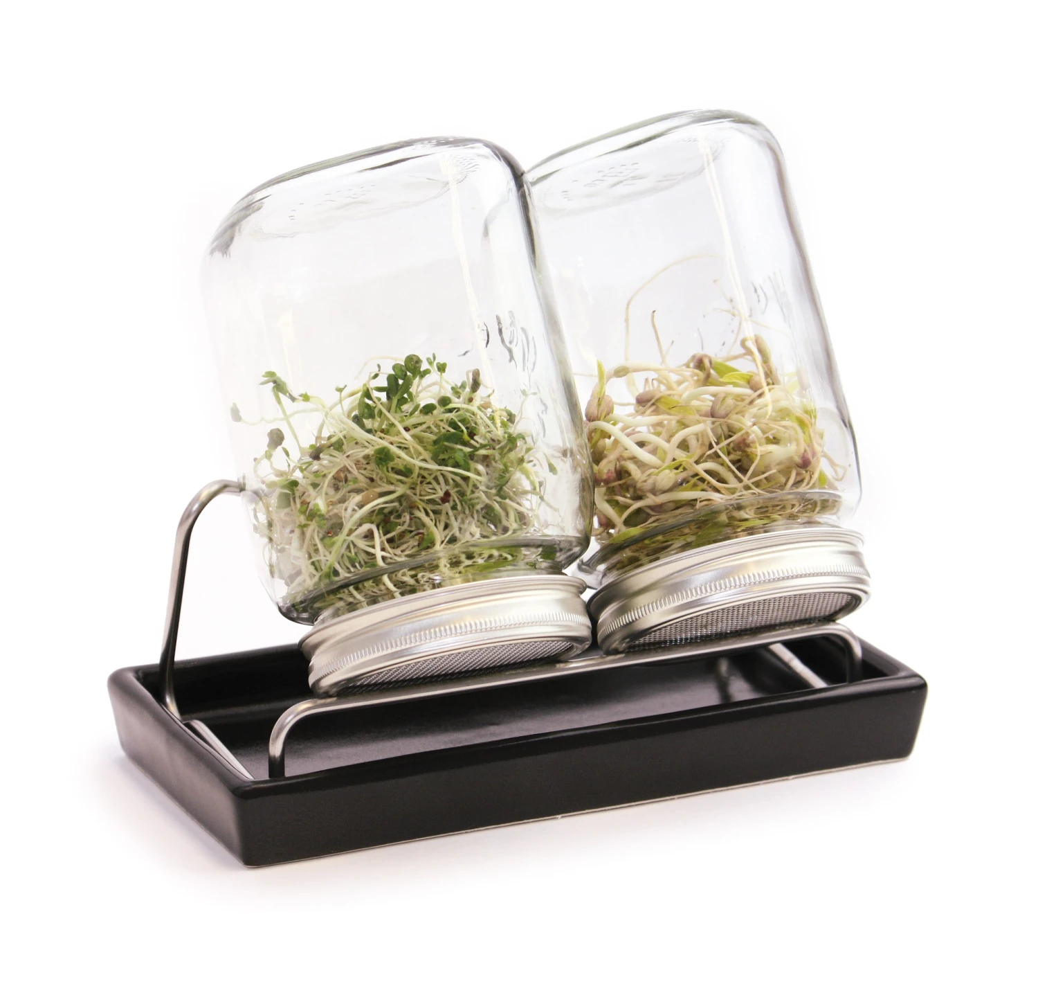 2 Sprossengläser 1000 ml mit feinmaschigem Sieb und Schraubring aus nickelfreiem Edelstahl, Abtropfgestell aus Edelstahl und und einer in Deutschland handgefertigten Abtropfschale in Keramik von sehr hochwertiger Qualität – hochgebrannt und lebensmittelecht glasiert -, inkl. einem Tütchen Bio-Keimsaat aus kontrolliert biologischem Anbau.