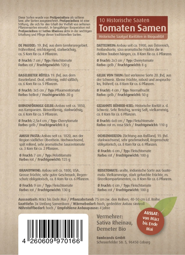 In unserem Saatgut-Set haben wir 10 besonders seltene und alte Tomatensorten zusammengestellt. Das Set enthält eine bunte Mischung verschiedener Cherry-, Pflaumen-, Fleisch- und Pelati-Tomaten. Genau das Richtige für alle Tomatenliebhaber*innen und Hobbygärtner*innen aber auch für den Profi. Die enthaltenen Sorten wurden von der Stiftung ProSpecieRara als seltene Pflanzensorten spezifiziert. Die Stiftung setzt sich für den Erhalt der Vielfalt seltener Pflanzensorten ein. Das Saatgut – sortenrein abgepackt – reicht für ca. 38 Pflanzen und beschert ab Juli eine reiche und bunte Tomatenernte. Der Vermehrer des Saatguts arbeitet nach Demeter-Richtlinien und setzt sich seit Jahrzehnten für ökologische und nachhaltige Landwirtschaft ein.