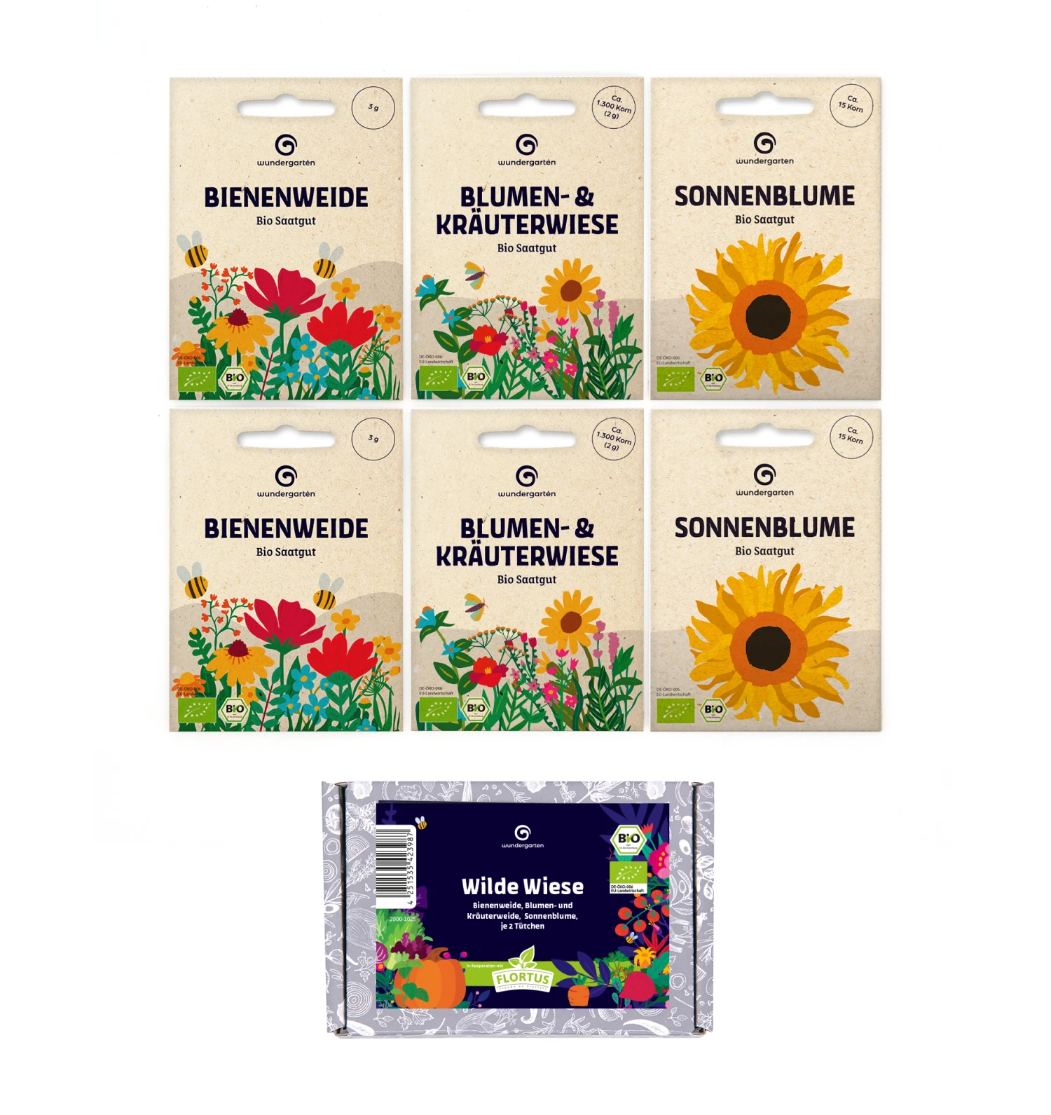 Wilde Wiesen sind wunderbare Insektenmagneten. Mit zahlreichen Blumen, Kräutern und Gräsern locken sie Bienen, Hummeln, Schmetterlinge und viele andere Insekten an. Das Set Wilde Wiesen ist eine wichtige Nahrungsquelle für Insekten. Durch die ungefüllten, duftenden Blüten finden Insekten leicht Pollen und Nektar. Das Wilde Wiesen Set können Sie im Garten oder in großen Pflanzkübeln auf dem Balkon aussäen. Im Set enthalten sind Sonnenblumen, Bienenweide und Blumen- und Kräuterweide. Alle Samen sind in BIO Qualität im Set enthalten.